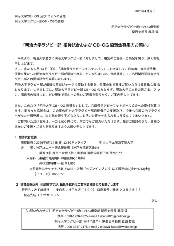 明治大学ラグビー部 招待試合およびOB・OG協賛金募集のお願い
